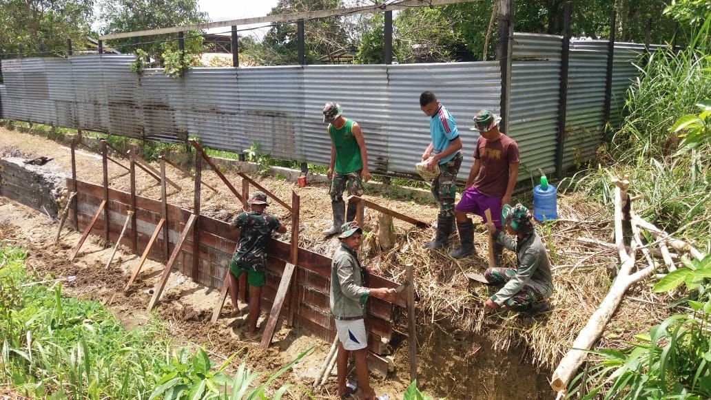 Untuk membantu Panti Asuhan Syalom Komandan Satgas Yonif 126/KC Letkol Inf Mulyo Junaidi mengerahkan 25 orang personel yang punya kemampuan tukang untuk membuat Talud penahan tanah dan air.
