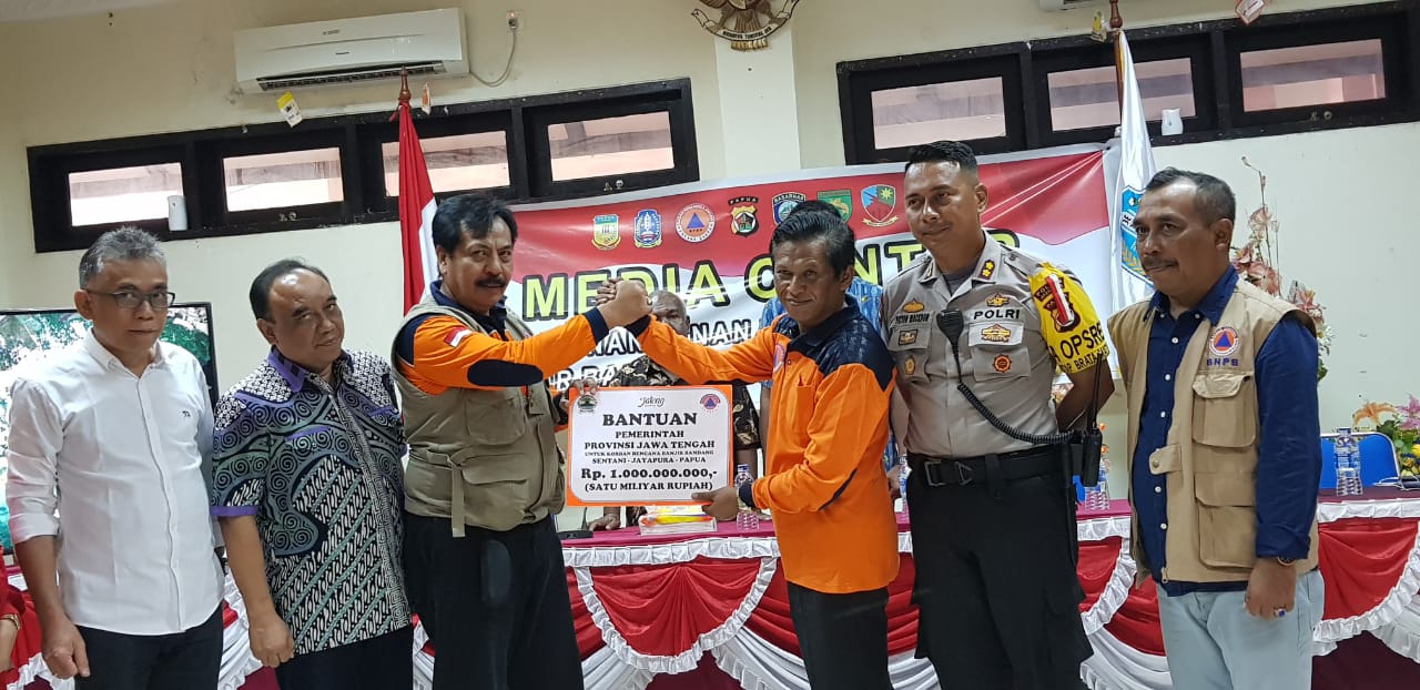 Bantuan tersebut diserahkan langsung oleh Gubernur Jawa Tengah, Ganjar Pranowo melalui Kepala Pelaksana Harian (Kalakhar) BPBD Provinsi Jawa Tengah, Drs. Sudaryanto, M.Si., kepada Wakil Bupati (Wabup) Jayapura Giri Wijayantoro, di Posko Induk Aula Lantai I Kantor Bupati Jayapura, Gunung Merah, Sentani, Kabupaten Jayapura, Jumat (19/4/2019) pagi pekan lalu.