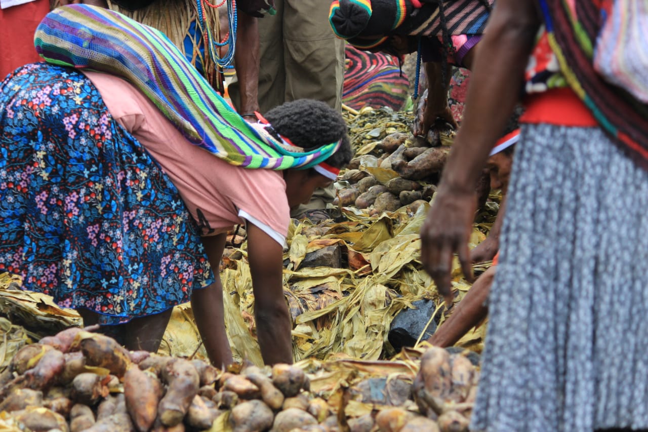 Diakhir acara seluruh masyarakat dan personel satgas TNI mengikuti acara selanjutnya yaitu tradisi bakar batu. Tradisi ini penting bagi masyarakat Papua khususnya suku pegunungan. Disebut bakar batu karena sebelumnya batu dibakar menjadi panas membara kemudian ditumpuk diatas bahan makanan yang akan dimasak.