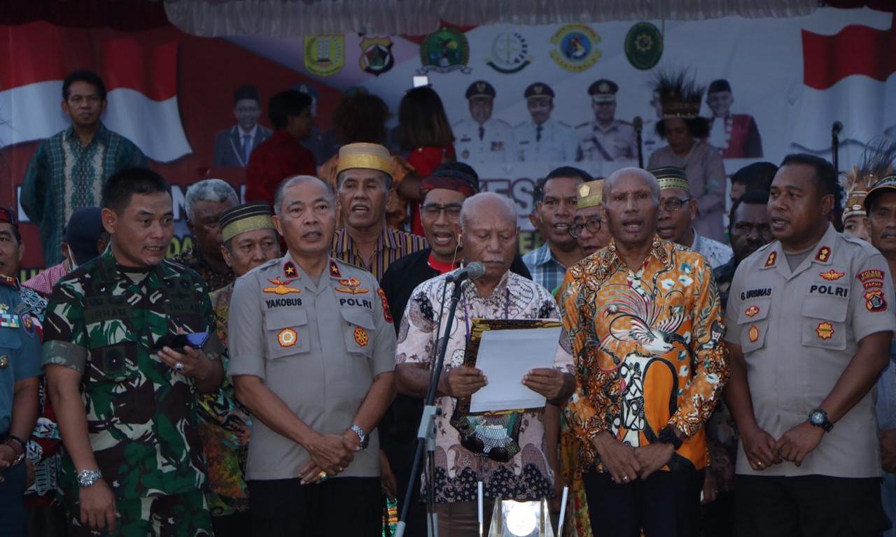 Pembacaan deklarasi dilakukan oleh Ondoafi Tahima Soroma Frans Sibi yang menyatakan komitmen bersama diantaranya Forkopimda Kota Jayapura bersama para tokoh agama, tokoh adat, tokoh masyarakat, tokoh pemuda, tokoh perempuan, ketua paguyuban, ketua BEM se-Jayapura, ketua perguruan tinggi dan ketua-ketua asrama se-Kota Jayapura.