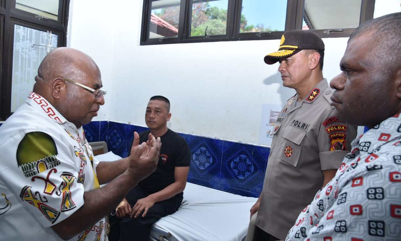 Gubernur Papua didampingi Kapolda Papua Irjen Pol Rudolf A Rodja dan Pangdam XVII/Cenderawasih Mayjen TNI Herman Asaribab mengunjungi Korban penganiayaan oleh oknum kelompok mahasiswa pengunjuk rasa di RS Bhayangkara, Kota Jayapura, Selasa.