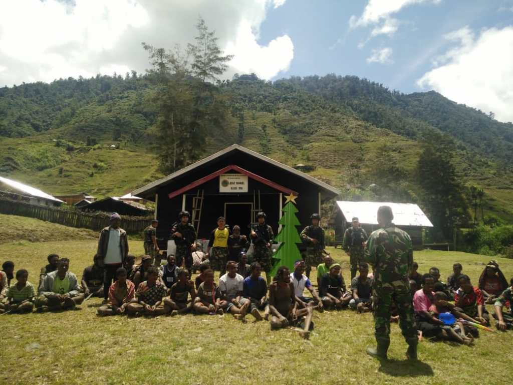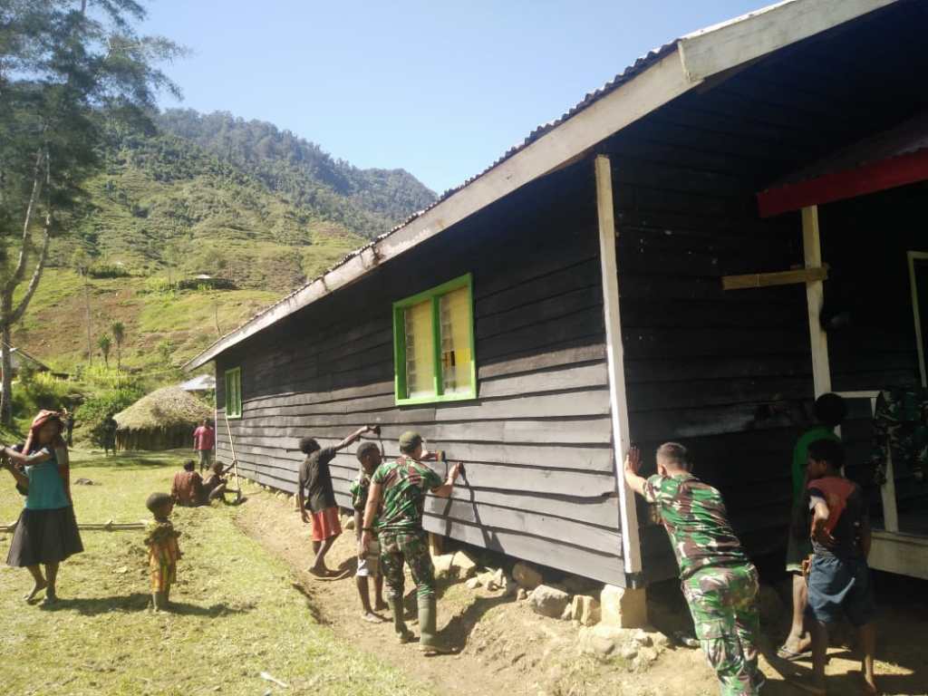 Nduga (Sentani News)- Jelang perayaan Natal Satgas YR 321/13/1 Kostrad kembali melaksanakan kegiatan Bakti Sosial (baksos) dengan melakukan perbaikan terhadap gedung Gereja Kingmi Jemaat Imanuel Kampung Ota Lama Distrik Mbua, Kabupaten. Nduga