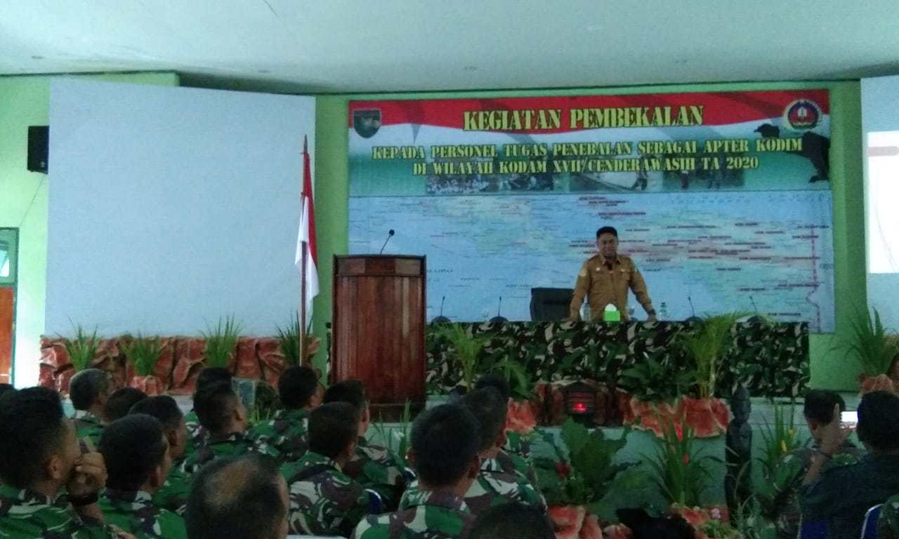 Sentani (Sentani News) – Persiapan pembukaan sejumlah Kodim baru di wilayah pegunungan Papua, Kepala Dinas Pendidikan dan Pengajaran (P & P) Provinsi Papua, Christian Sohilait, ST, M.Si., beri pembekalan kepada personel tugas penebalan sebagai apter Kodim di wilayah Kodam XVII/Cendrawasih TA 2020.
