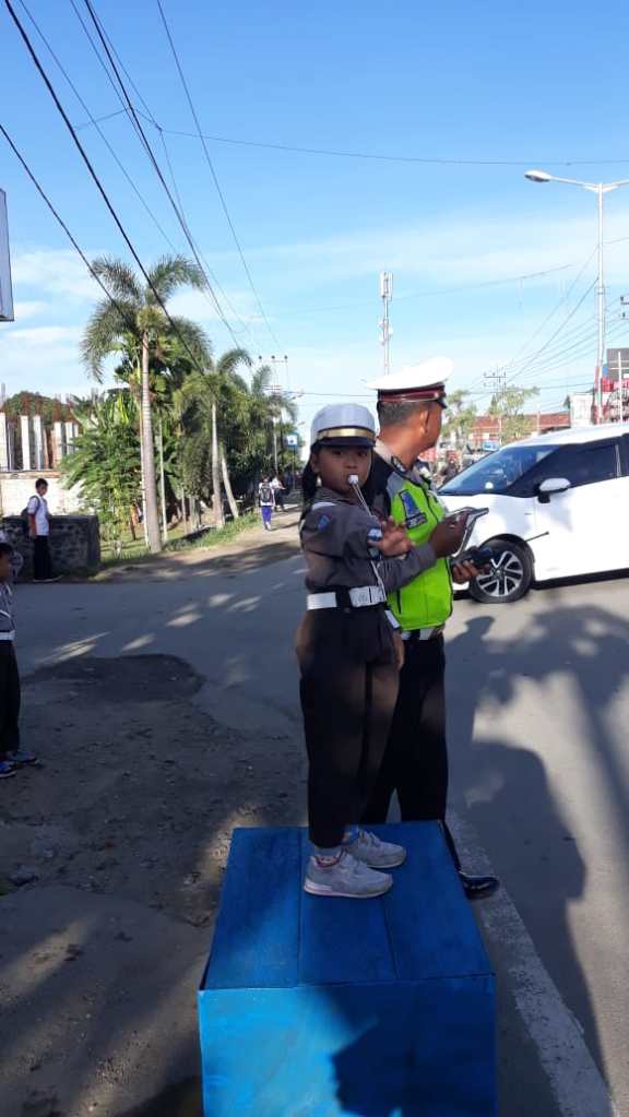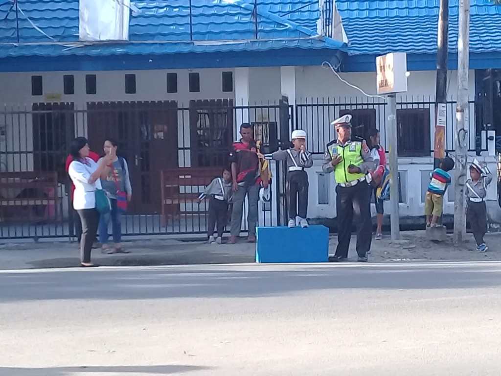 Sentani (Sentani News)- Satuan Lalu Lintas Polres Jayapura bersama anak – anak TK Kemala Bhayangkari 04 Sentani, mengatur lalulintas di depan Masjid Al Aqsa Sentani Kabupaten Jayapura, Rabu (29/1/2020) pagi.