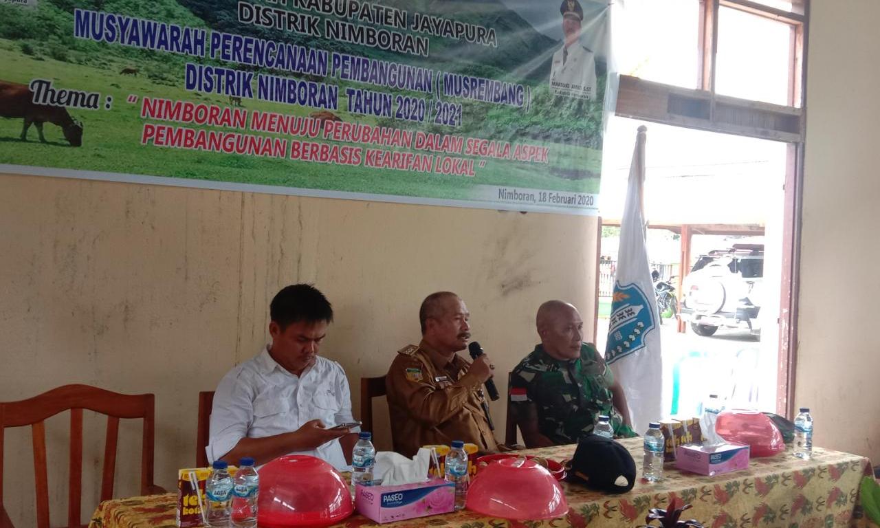 Kepala Distrik (Kadistrik) Nimboran Marzuki Ambo, S.ST., kepada wartawan usai pembukaan Musrenbang Distrik tahun 2020 dengan tema Nimboran menuju perubahan dalam segala aspek pembangunan berbasis kearifan lokal ini dapat terlaksana dimulai dari tingkat lingkungan kemudian diteruskan ke Musrenbang tingkat Kampung/Kelurahan pada bulan Januari 2020.