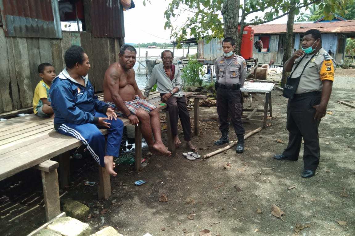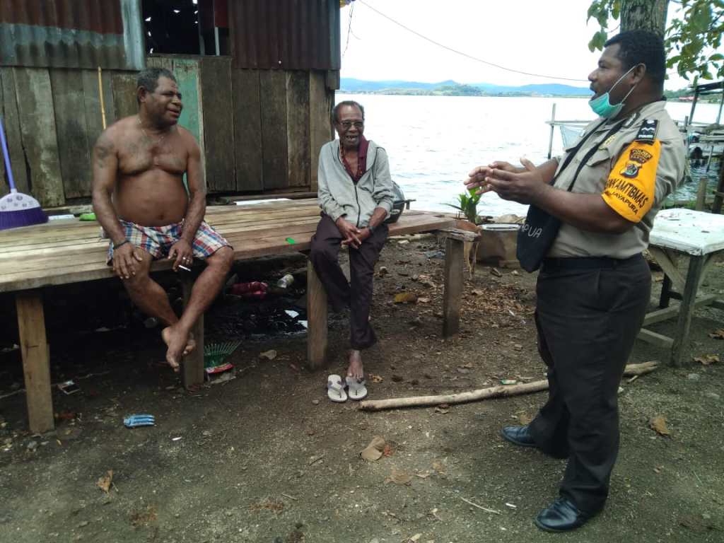 Bhabinkamtibmas Polsek Sentani Timur Aipda Paulus Makuba bersama anggota Polsek Sentani Timur melaksanakan patroli dan sambang ke warga Kampung Nendali guna memyampaiakan himbauan terkait Maklumat Kapolri dan Edaran Bupati tentang upaya pencegahan penyebaran virus corona.
