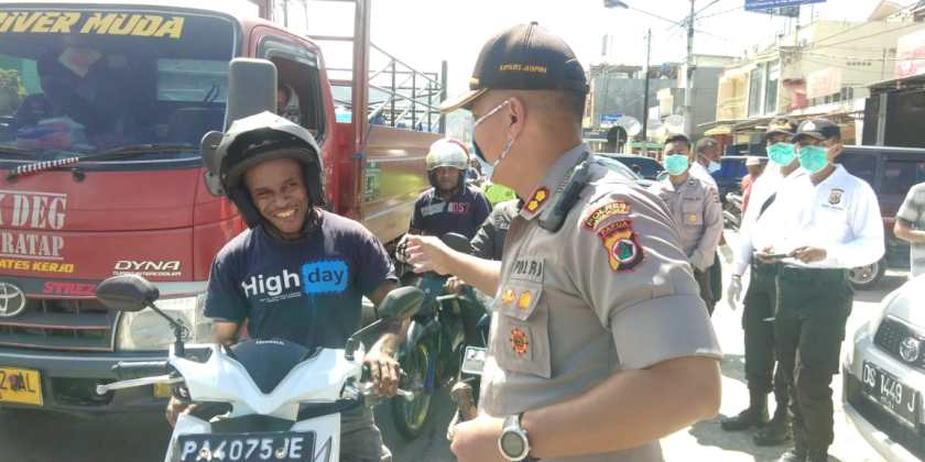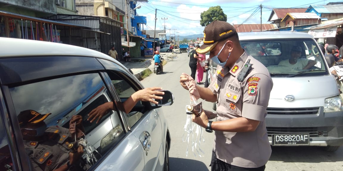 1000 masker dan 1000 sabun cuci tangan serta 50 paket sembako yang dibagikan langsung oleh Kapolres Jayapura AKBP Victor Dean Mackbon, SH., S.IK., MH., M.Si, bersama anggota DPRD Kabupaten Jayapura Fraksi Bhineka Tunggal Ika (BTI), H. Wagus Hidayat, SE dan Bhayangkari Cabang Jayapura Ayudya Victor Mackbon dan masing – masing anggotanya di lampu merah pertigaan pasar lama Sentani, dibagikan langsung kepada masyarakat pengguna jalan, dan mama – mama penjual sebagai bentuk upaya kepedulian pencegahan penyebaran virus Corona/Covid-19 di Sentani Kabupaten Jayapura.