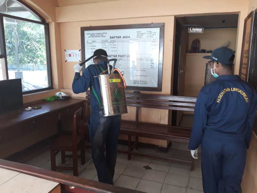 Kegiatan itu dipimpin langsung oleh kepala Puskesmas dr. Hanover yang didampingi kanit Binmas Polsek Sentani Timur, Aipda Paulus V. Makuba bersama dosen dan mahasiswa Poltekes Jayapura di fasilitas – fasilitas umum yang ada di Distrik Sentani Timur Kabupaten Jayapura guna mencegah penyebaran virus corona.