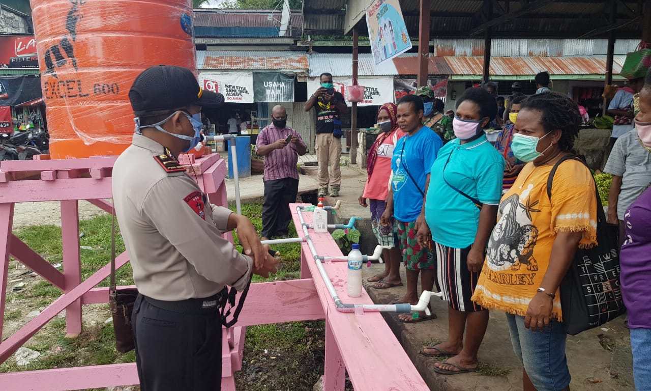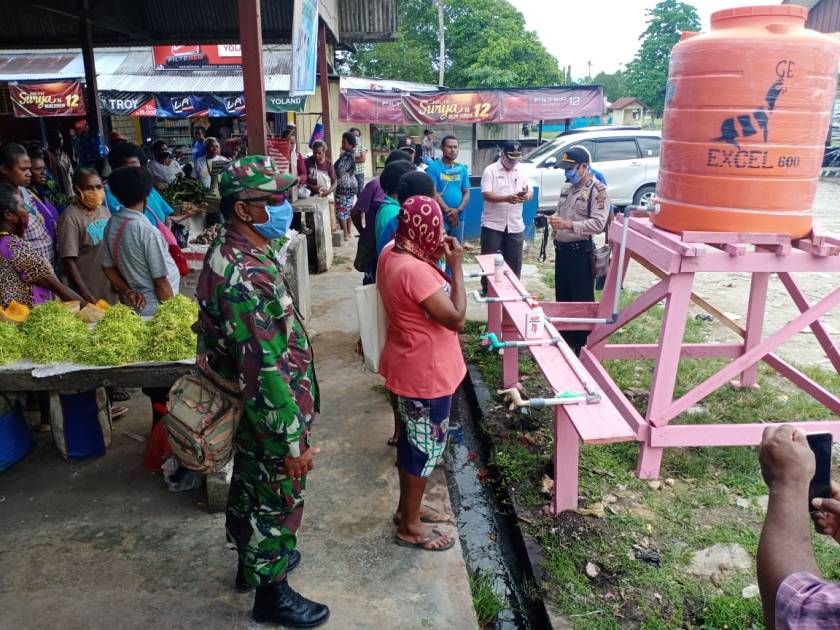 Sentani (Sentani News) – Tim gugus tugas bersama Kapolsek Nimboran Ipda Mathius Agian, SH, memantau pos gugus tugas relawan dan sosialisasi tentang imbauan Pemerintah, serta edukasi cuci tangan yang benar terhadap warga masyarakat di Pasar tradisional Genyem Distrik Nimboran Kabupaten Jayapura.