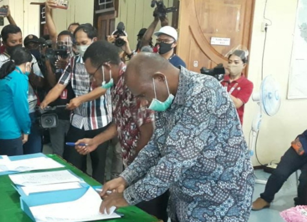 KASONAWEJA – Komisi Pemilihan Umum (KPU) Mamberamo Raya mengapreasiasi kehadiran pasangan calon (paslon) bupati dan wakil bupati Mamberamo Raya, Kristian Wanimbo dan Yonas Tasti (Wan-Tas) bersama tim yang hadir dalam rapat pleno penetapan di Kasonaweja, Kabupaten Mamberamo Raya, Papua, Rabu.