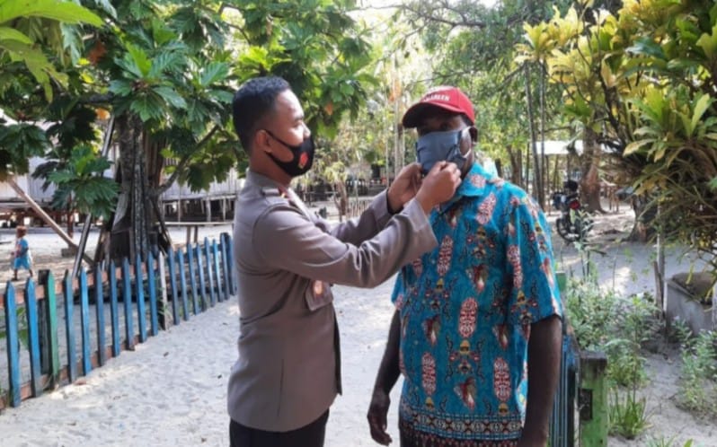 SENTANI – Warga di Kampung Bukisi, Distrik Yokari, Kabupaten Jayapura diberikan masker gratis guna pencegahan penyebaran virus corona atau COVID-19 dan penyampaikan imbauan kamtibmas oleh Polsek Demta.