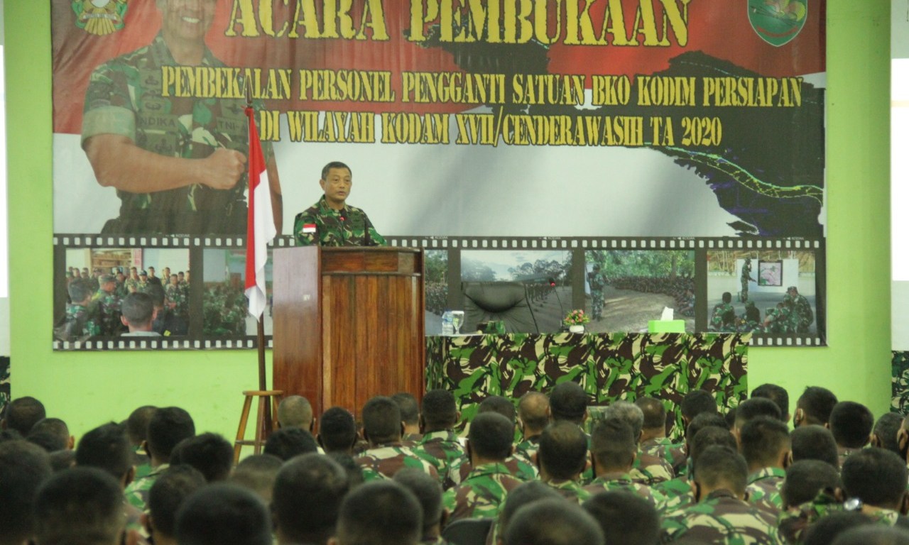 SENTANI – Komandan Korem (Danrem) 172/PWY Brigjen TNI Izak Pangemanan memberikan pembekalan kepada personel pengganti satuan BKO Kodim Persiapan di wilayah Kodam XVII/Cenderawasih Tahun Anggaran 2020, bertempat di Aula Serbaguna Rindam XVII/Cenderawasih, Sentani, Kabupaten Jayapura, Papua, Selasa (8/12).
