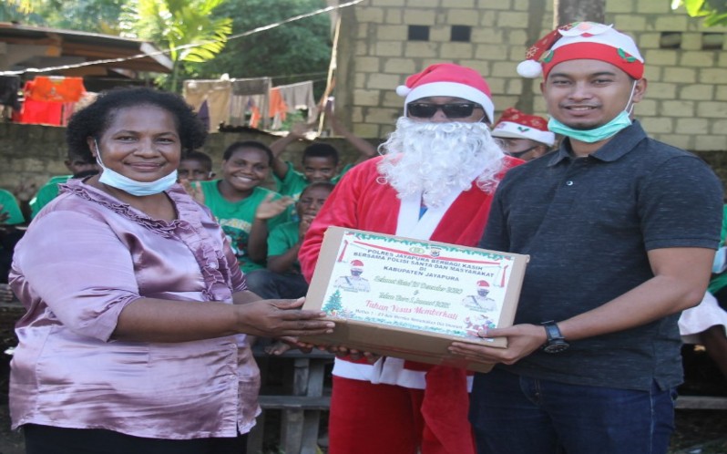 SENTANI – Polisi Santa Claus Polres Jayapura kunjungi anak-anak panti asuhan dalam rangka menyambut perayaan Natal 25 Desember 2020.