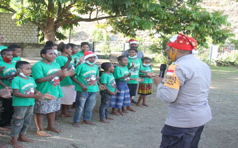 SENTANI – Polisi Santa Claus Polres Jayapura kunjungi anak-anak panti asuhan dalam rangka menyambut perayaan Natal 25 Desember 2020.