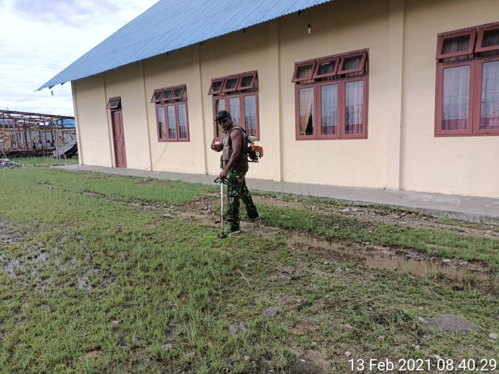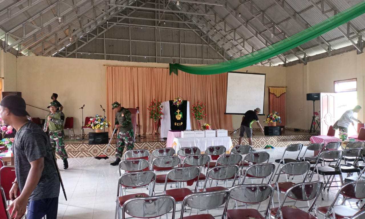 Nduga, – Prajurit TNI dari Koramil 1715-07/Keneyam menggelar kunjungan kasih dan giat bersih-bersih di Gereja Kingmi Jemaat Yerusalem Kota Keneyam, Kabupaten Nduga, Papua.