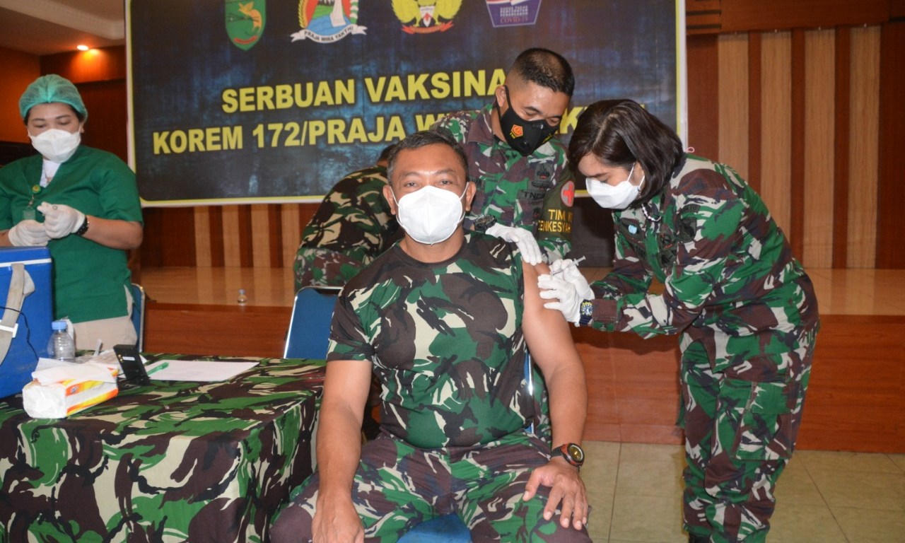 Komandan Korem 172/PWY Brigjen TNI Izak Pangemanan sebagai orang pertama penerima vaksin menyampaikan, bahwa hari ini Korem 172/PWY melaksanakan vaksinasi, sebagai tindaklanjut dari Program Pemerintah dalam rangka penanganan covid-19.
