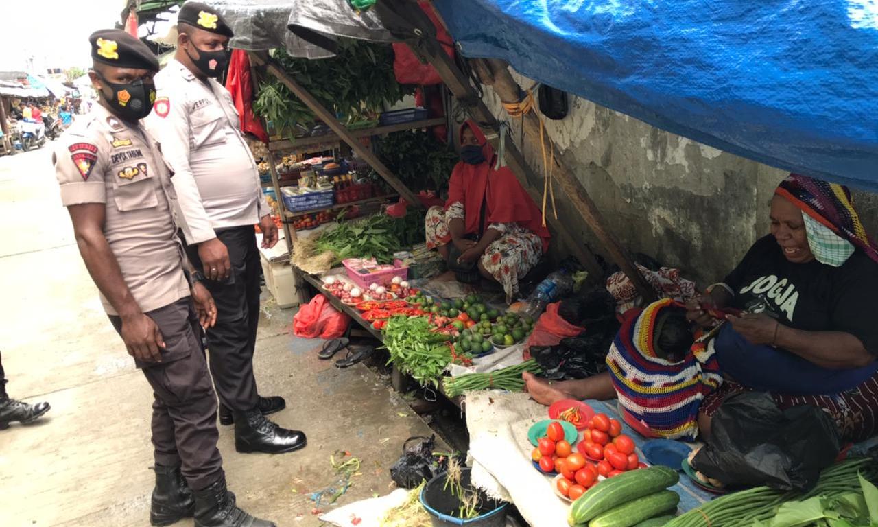 SENTANI – Satuan Samapta Polres Jayapura memantau langsung tingkat kepatuhan masyarakat baik pedagang maupun pembeli guna menegakkan disiplin untuk mematuhi protokol kesehatan di Pasar Lama Sentani, Kabupaten Jayapura, Papua, Rabu.