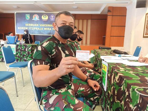 “Ini saya vaksin yang kedua, setelah pertama kalinya pada dua pekan lalu,” katanya usai vaksinasi didampingi sejumlah pejabat Korem 172/PWY.
