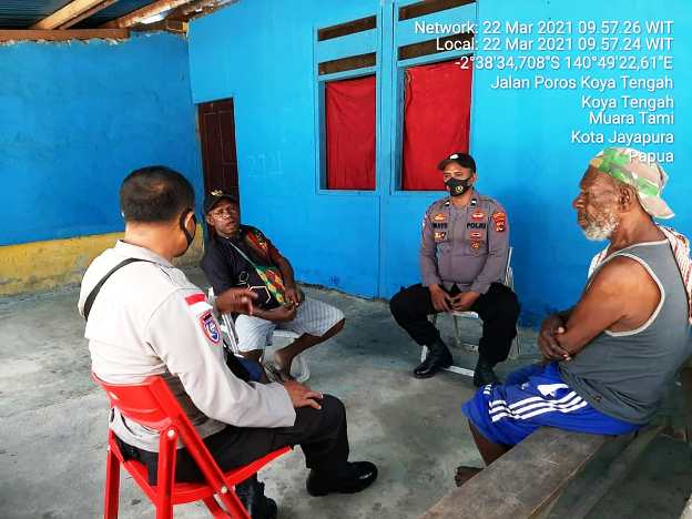JAYAPURA – Kanit Binmas Polsek Muara Tami Iptu Tarto melaksanan kunjungan Door to Door System (DDS) ke tokoh masyarakat Kampung Koya Tengah bertempat di Distrik Muara Tami, Kota Jayapura, Papua, Senin pagi.