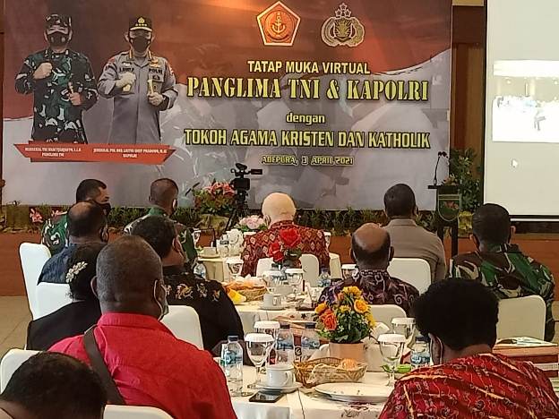 JAYAPURA – Panglima TNI Marsekal Hadi Tjahjanto dan Kapolri Jenderal Pol Listyo Sigit yang diwakili Kabaintelkam Komjen Pol Paulus Waterpauw bersaam Gubernur Papua Barat Dominggus Mandacan menggelar tatap muka virtual dengan para tokoh agama di Papua dan Papua Barat.