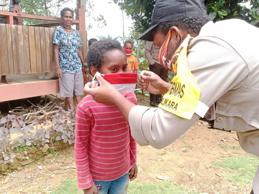Tolikara – Bhayangkara Pembina Keamanan dan Ketertiban Masyarakat (Bhabinkamtibmas) Polres Tolikara memberikan sosialisasi dan edukasi tentang protokoler kesehatan kepada anak – anak di Kampung Bandia, Distrik Karubaga, Kabupaten Tolikara pada Senin siang (5/4).