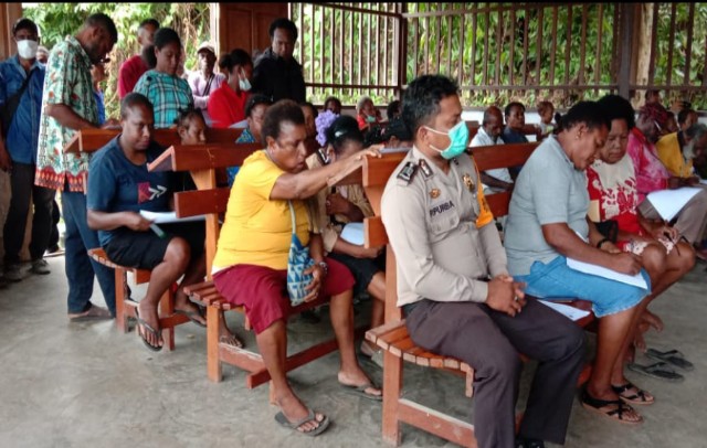 SARMI – Bripka Prajabatan Purba sebagai babinkamtimas membantu mengamankan kegiatan DPRD Kabupaten Sarmi dalam menjaring aspirasi masyarakat di Kampung Neidam, Distrik Sarmi Kota, Kabupaten Sarmi, pada Sabtu (10/04)