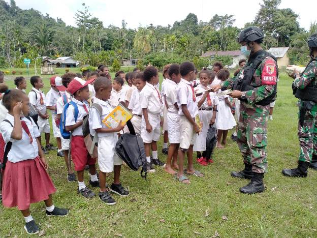 ARSO – Demi terciptanya generasi penerus bangsa yang berkualitas, prajurit TNI dari Satgas Pamtas RI-PNG Yonif Mekanis 512/QY Pos Wembi membagikan buku tulis dan tas sekolah kepada anak-anak di SD YPPK Wembi Distrik Mannem, Kabupaten Keerom, Papua.