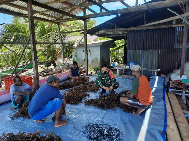 Seperti yang dilakukan oleh Babinsa Koramil 1709-01/Yapsel Serda Mujianto kali ini, tampak menyambangi kediaman salah satu warga binaannya yang sedang melakukan pembibitan rumput laut di Kampung Sarawandori II, Distrik Kosiwo, Kabupaten Kepulauan Yapen, Papua.
