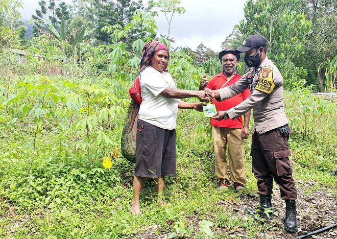 KOBAKMA – Dalam rangka mengembangkan sektor pertanian, Bhabinkamtibmas Polsek Kelila Briptu Saul Waseway menyambangi dan memberikan bibit tanaman kepada Keluarga Dinus Kogoya, di Kampung Kindok, Distrik Kelila, Kabupaten Mamberamo Tengah, Papua.
