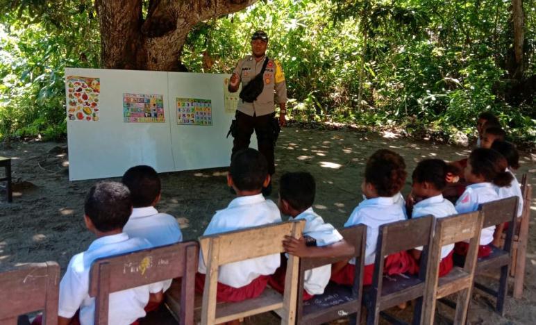 SERUI – Bertempat di SD YPK Woda Wasma, personel Bhabinkamtibmas Kampung Woda, Distrik Raimbawi Yapen Timur, Brigadir Ramli Piabang melaksanakan kegiatan Polisi Pi Ajar.