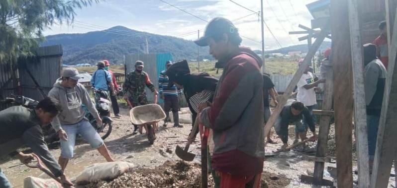 WAGHETE – Babinsa Koramil 1703-02/Waghete Sertu Natalis dan Serda Warsimin, bersama warga melaksanakan karya bhakti pengecoran tiang Gereja Pantekosta serikat Indonesia (GPSI) di Kampung Idege, Distrik Tigi, Kabupaten Deiyai, Papua.