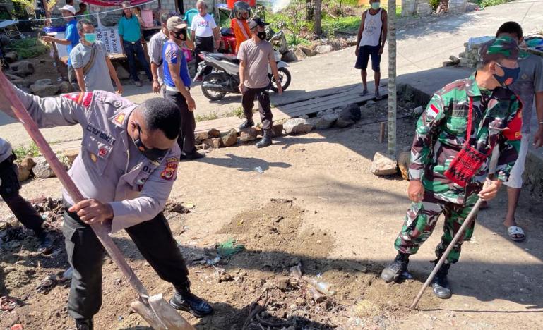 JAYAPURA – Wujud rasa kepedulian terhadap korban kebakaran Kepala Distrik Abepura Dionisius JA Deda, S.STP bersama Kapolsek Abepura AKP Clief G Philipus Duwith, SE, SIK dan Danramil 1701-03/Abepura Kapten Inf Yubelinus Simbiak melaksanakan bhakti sosial di lokasi kebakaran tepatnya di Kompleks Belakang Pompa Bensin Kamkey, Keluaraha Awiyo, Distrik Abepura, Kota Jayapura, Kamis (29/4).
