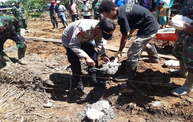 Sarmi – Kapolsek Pantai Timur Iptu Arifin Nasim mewakili Kapolres Sarmi AKBP Hapry Lanudjun S.Sos, MM hadiri karya bakti TNI dalam peletakan batu pertama pembangunan Masjid Ar Rahim di Kampung Persiapan Dorba, Distrik Pantai Timur, Kabupaten Sarmi, Papua, Sabtu (12/06).