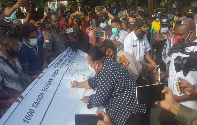 Selain menuntut agar jalan segera diperbaiki, warga juga melakukan petisi tanda tangan supaya ruas jalan yang menghubungkan ke pelabuhan peti kemas di Depapre segera diperbaiki.