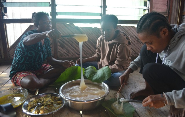 Pada awalnya sempat ragu, khawatir papeda berubah warna menjadi merah atau rasanya berubah. Setelah dicoba, warna tidak berubah dan rasa papeda tetap sama.