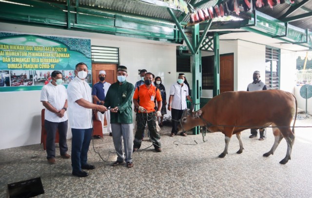 Jayapura – Komandan Korem (Danrem) 172/PWY Brigjen TNI Izak Pangemanan menyerahkan hewan qurban berupa satu ekor sapi secara simbolis kepada panitia qurban Masjid Ridho Allah Asrama Bucend III Waena, Distrik Heram, Kota Jayapura, Papua, Selasa (20/07).