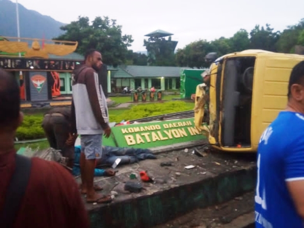 Sentani – Kecelakaan lalu lintas tunggal sebuah truk terjadi di Jalan Raya Sentani – Kemiri yang menabrak pagar markas Yonif RK 751/VJS Sentani, Kabupaten Jayapura, Papua, pada Sabtu (24/07) sore.