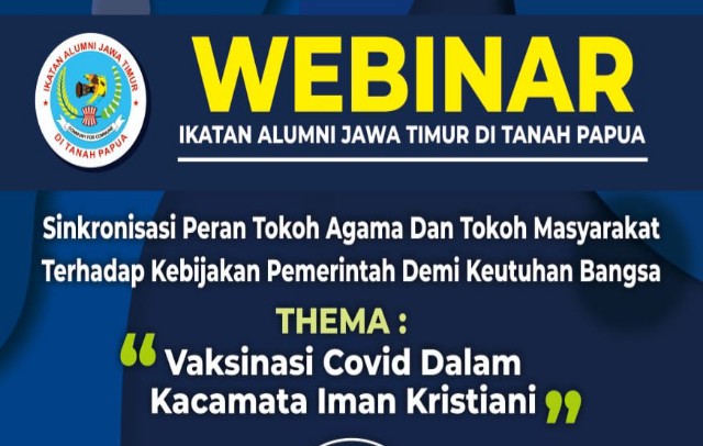 Jayapura – Ikatan Alumni Jawa Timur di Papua menggelar webinar dengan judul “Sinkronisasi Peran Tokoh Agama dan Tokoh Masyarakat terhadap Kebijakan Pemerintah Demi Keutuhan Bangsa dengan tema Vaksinasi COVID-19 Dalam Kacamata Iman Kristiani”.
