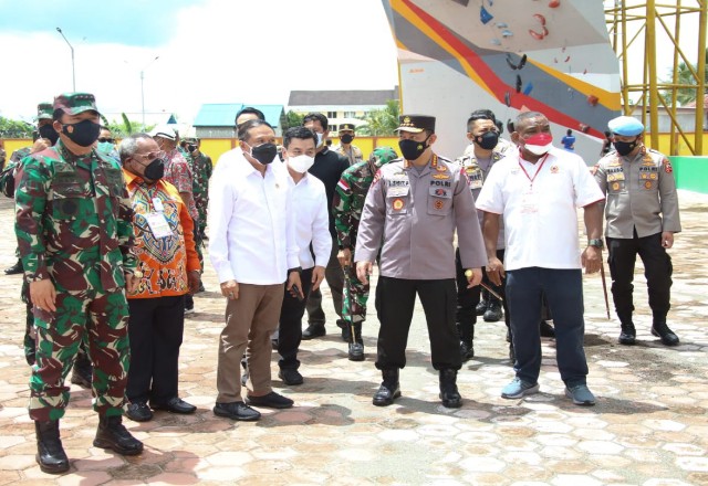 Sentani – Panglima TNI Marsekal Hadi Tjahjanto, Kapolri Jenderal Listyo Sigit Prabowo dan Menpora Zainudin Amali melakukan peninjauan venue pertandingan panjat tebing dan biliar PON ke-XX di Kabupaten Mimika, Papua, Sabtu (28/08).