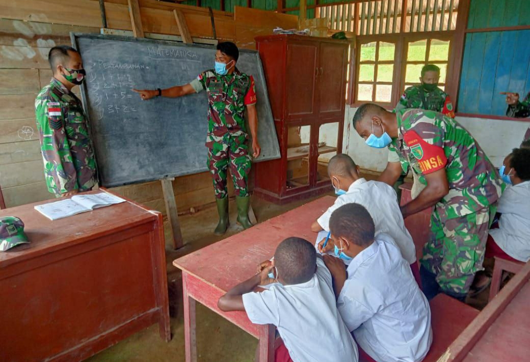 Pada kesempatan tersebut, Para Babinsa Koramil Waropko memberikan materi pelajaran dasar menulis, membaca dan berhitung kepada murid Sekolah Dasar Tembutkalama.