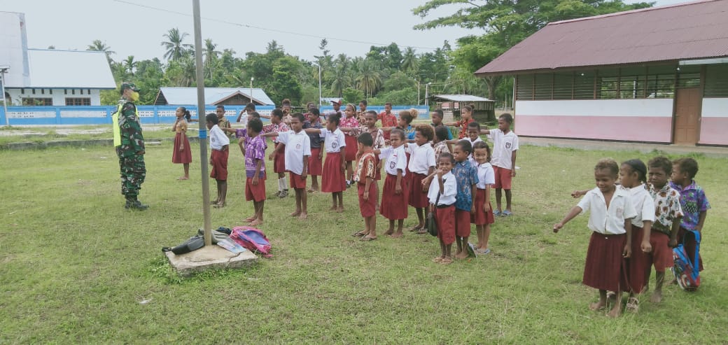 Numfor – Guna membentuk karakter dan disiplin sejak usia dini, Babinsa Koramil 1708-05/Numfor Sertu Sampurno memberikan pelatihan Peraturan Baris Berbaris (PBB) kepada pelajar Sekolah Dasar Negeri 1 Manggari, Kampung Manggari, Distrik Poiru, Kabupaten Biak Numfor, Papua, Senin 18 April 2022.