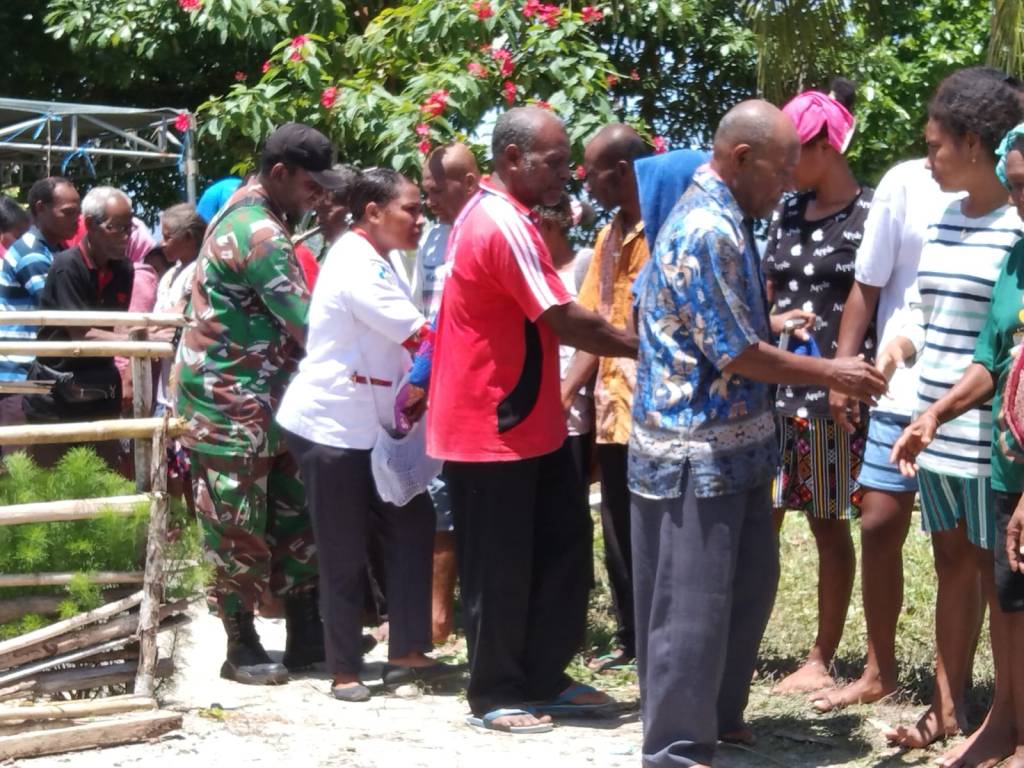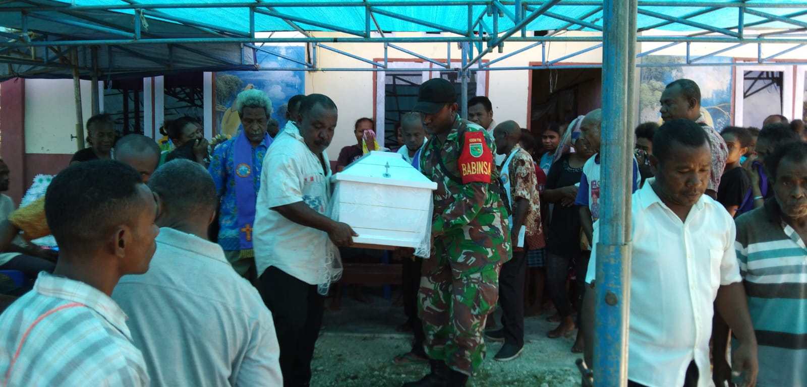 Babinsa Posramil 1708-02/BU-Warsa Sertu Paulus Karuapi menghadiri prosesi pemakaman almarhum Ibu Terkasih Eci Baransano yang tidak lain adalah istri dari Kepala Kampung Koyomi, Lodwik Infandi, dengan serangkaian prosesi pemakaman dari rumah hingga menuju tempat peristirahatan terakhir di Kampung Koyomi, Distrik Warsa, Kabupaten Biak Numfor, pada Rabu 20 April 2022.