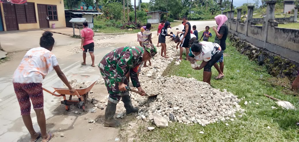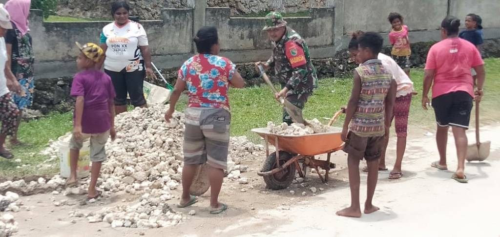 Biak – Babinsa Koramil 1708-01/Biak Kota, Sertu Sukiman, bersama warga binaan melakukan gotong royong memperbaiki akses jalan yang rusak dan berlubang di Kampung Darfuar, Distrik Samofa, Kabupaten Biak Numfor, Papua, Kamis 21 April 2022.