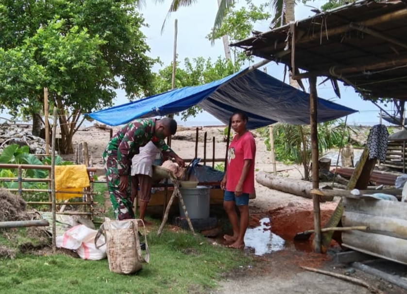 Warsa – Guna tingkatkan Komunikasi Sosial (Komsos) disemua lini dan wilayah teritorial, Babinsa Posramil 1708-02/BU-Warsa Sertu Melkianus Nap melaksanakan komunikasi sosial bersama ibu-ibu pembuat sagu yang ada wilayah binaan, tepatnya di Karmon, Distrik Yawosi, Kabupaten Biak Numfor, Papua, Minggu, 24 April 2022.