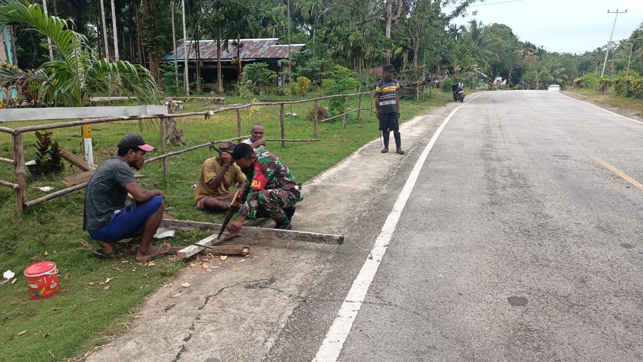 Biak Utara – Inilah cara Babinsa Koramil 1708-02/BU Serka D. Kafiar mendekati dan merebut hati warga dengan ikut bergotong royong pembuatan pagar sepanjang jalan di Kampung Yopdi, Distrik Biak Utara, Kabupaten Biak Numfor, Papua, Minggu 24 April 2022.
