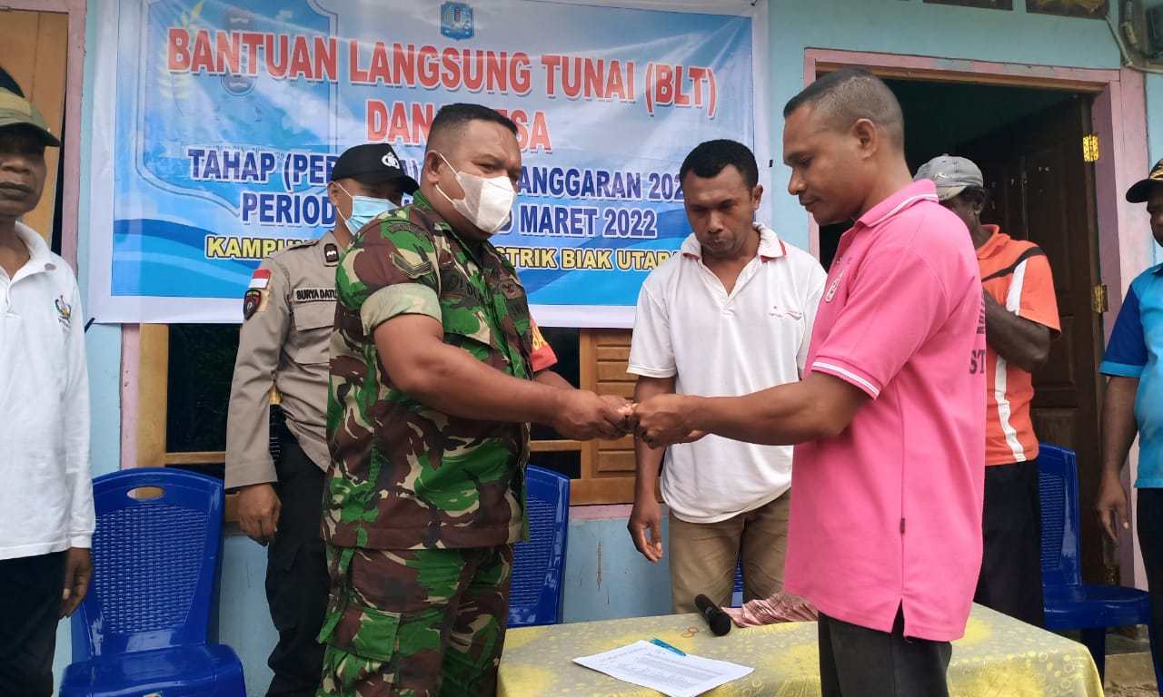 Biak Utara – Babinsa Koramil 1708-02/BU, Serda Dedi Kamok dan Babinkamtibmas Aipda Surya Datuk mendampingi pembagian BLT TA 2022 di Desa Saukobye, Distrik Biak Utara, Kabupaten Biak Numfor, Papua, Senin 25 April 2022.