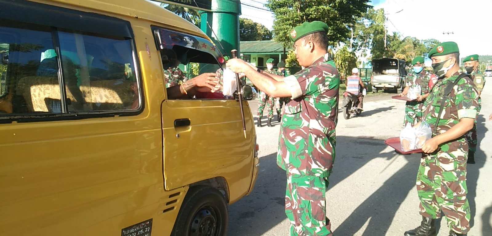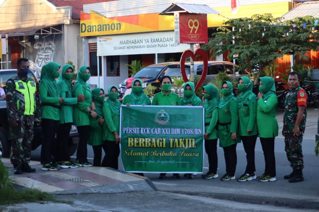 Biak – Dandim 1708/BN, Letkol Inf J. Daniel P. Manalu S.H., M.I.Pol dan Ketua Persit KCK Cabang XXI Dim 1708/BN Ny. Elfin Daniel P. Manalu beserta pengurus Persit membagikan takjil gratis kepada pengguna jalan dan masyarakat yang melintas di jalan Sriwijaya dan Jalan Imam Bonjol, Kabupaten Biak Numfor, Papua, Selasa 26 April 2022.