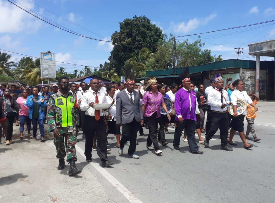 Biak – Babinsa Kampung Syabes Serda Andarias Pariaribo, mendampingi warga untuk mengantar ibu Pendeta Alfonsina Heni Aibekob S.ss.Teol dari Jemaat GKI Firdaus Syabes, Kampung Syabes, Distrik Yendidori, ke Jemaat GKI Elisabet Aibekobfuar Dolog, Kabupaten Biak Numfor, Papua, Rabu 27 April 2022.