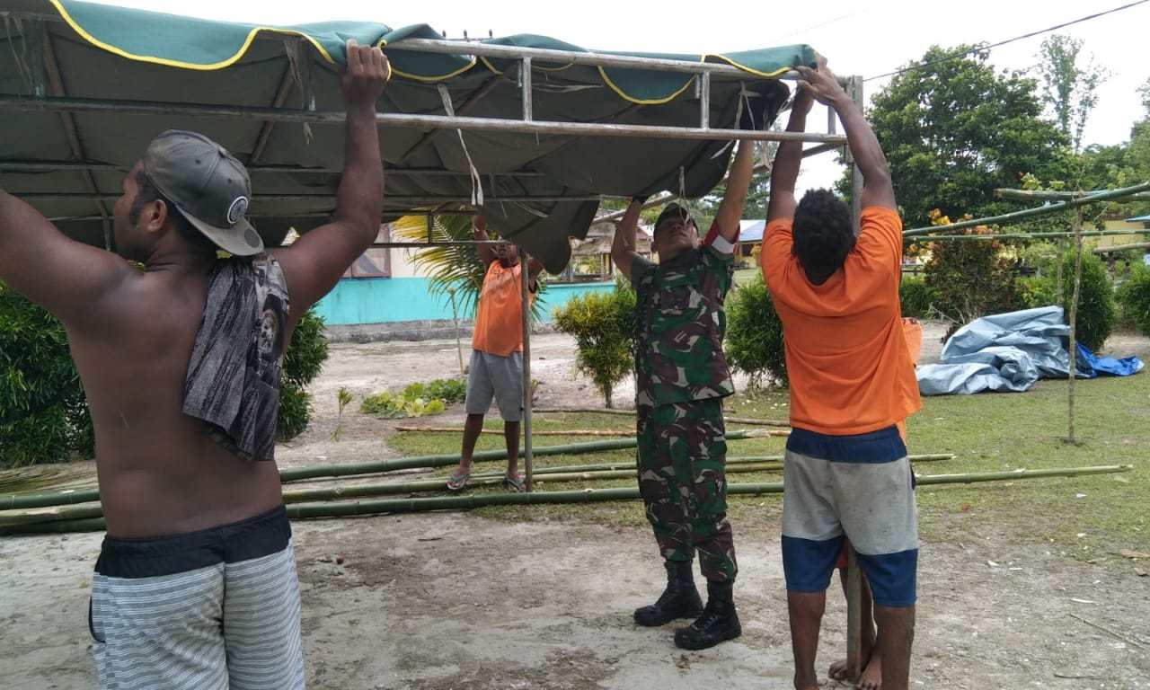 Supiori – Anggota Koramil 1708-06/SU Serda Suyuti, ikut serta membantu warga mendirikan tenda dalam rangka syukuran pelantikan kepala Desa dan Bamuskam Desa Douwbo Distrik Supiori Utara, Kabupaten Supiori, Papua, Kamis 28 April 2022.