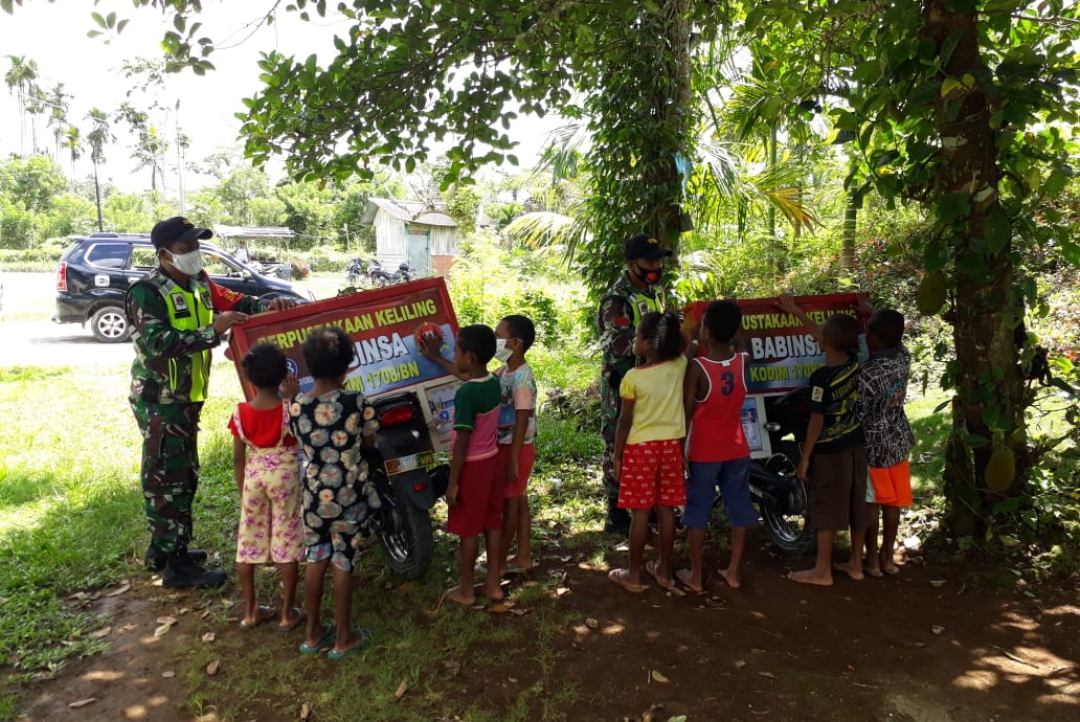 Biak Barat – Babinsa Koramil 1708-03/BB Sertu Filipe Marandof dan Praka Elisa Kapisa melakukan inovasi dalam pemberdayaan kemanunggalan TNI dengan rakyat, salah satunya melalui perpustakaan keliling sebagai Sarana Interaksi dan Komunikasi Sosial (SI-Komsos) di wilayah binaan di Kampung Warberik, Distrik Biak Barat, Kabupaten Biak, Papua, Minggu 1 Mei 2022.